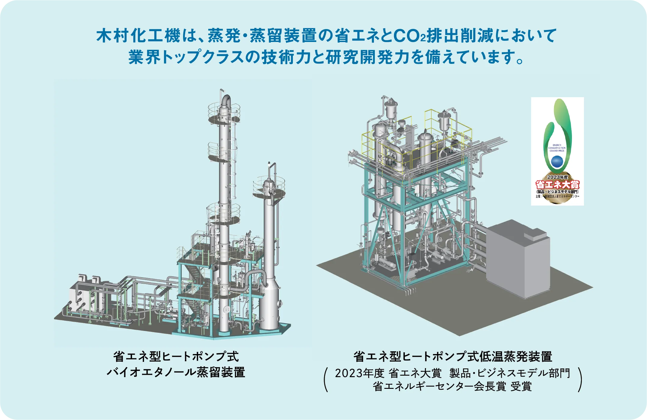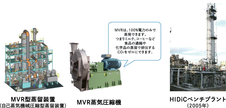 当社は1999年にNEDOの研究開発プロジェクトで理論上最高の省エネ性能を持つ「HIDiC(内部熱交換型蒸留塔)」の世界初の実証実験に成功。その後もMVR(自己蒸気機械圧縮)型蒸留装置、「省エネ型汎用ヒートポンプ式アンモニア回収装置」等、省エネ型蒸留装置・回収装置を開発しており、蒸発・蒸留の省エネ技術においては業界トップクラスの技術力を有しています。