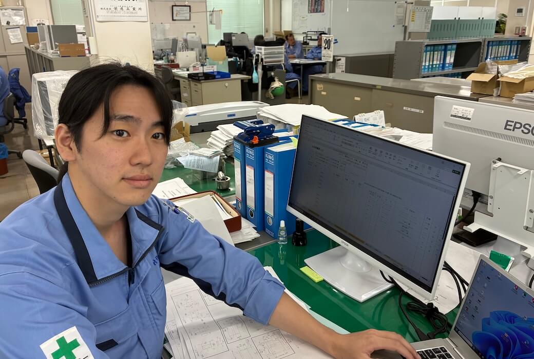 工場で製作する製品の工務(生産管理)をしています。設計部門が描いた図面をもとに材料の手配、製作手順の検討、コスト管理等、頭を悩ます分刺激のある仕事です。